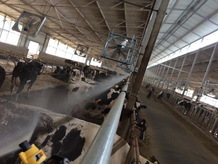 当牛到饲喂通道吃草时智能感应系统感应到牛的体温才开始喷淋工作。没有牛的时候感应不到牛的存在,这样的话是不会进行工作的,达到节水减排、节能环保的目的。亦可以和风机联动,控制风机的运转,进一步节能。